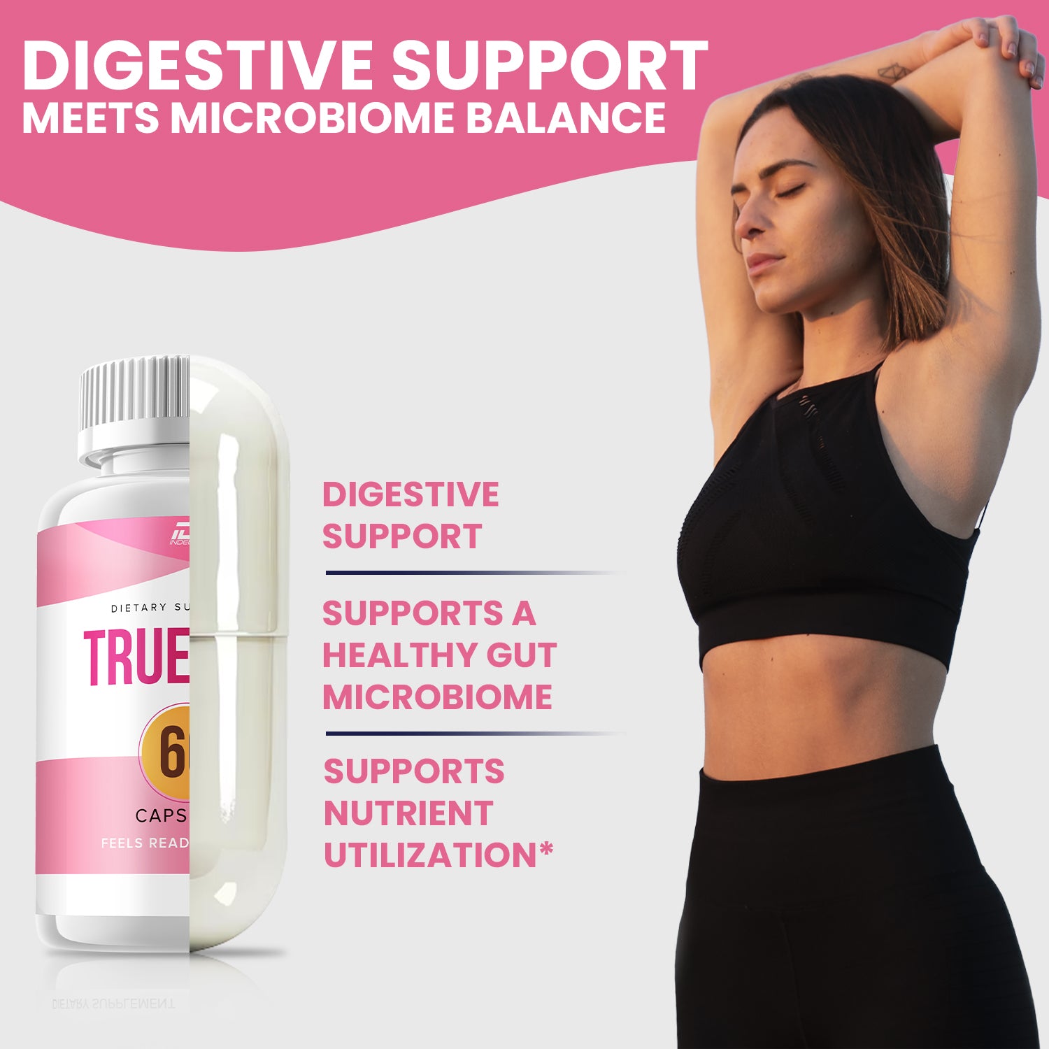 Experience comprehensive relief with True Fem! This advanced formula is specifically designed to support a balanced gut microbiome and promote healthy, radiant skin. By fostering a smoother and more regular digestive system, True Fem enhances your overall comfort and well-being.